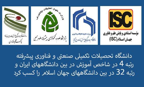دکتر حسین محبی رئیس دانشگاه تحصیلات تکمیلی صنعتی و فناوری پیشرفته گفت: بر اساس گزارش مؤسسه استنادی و پایش علم و فناوری جهان اسلام (ISC) دانشگاه تحصیلات تکمیلی صنعتی و فناوری پیشرفته موفق شد رتبه 4 در شاخص آموزش در بین دانشگاههای ایران و رتبه 32 را در همین شاخص در بین دانشگاههای جهان اسلام کسب کند.